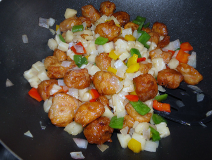 Junte o abacaxi e o molho preparado,mexendo sempre, deixe cozinhar lentamente por 1 minuto.Reserve.