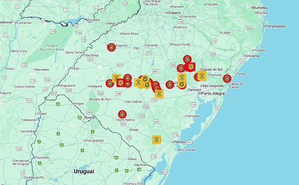 O mapa que mostra os bloqueios e alterações no tráfego de rodovias é atualizado pelo Comando Rodoviário da Brigada Militar (CRBM), Polícia Rodoviária Federal (PRF), pelo Departamento Autônomo de Estradas de Rodagem (Daer) e pela Empresa Gaúcha de Rodovias (EGR). No mapa é possível conferir a situação de rodovias estaduais, concedidas e federais.