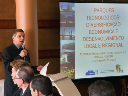 “A Secretaria é parceira e pode ajudar, existem recursos e faltam projetos”, pontuou Cléber Prodanov em sua fala, lembrando que é preciso promover a interação entre universidade, empresa e poder público. Atualmente o Estado possui apenas três parques tecnológicos em funcionamento, mas o governa já analisa a proposta de criação de outros quinze, em um investimento de R$1 milhão. Hoje são dezenove incubadoras tecnológicas registradas e certificadas em doze cidades gaúchas, mas o estado já chegou a ter 60 delas, porem morreram por descaso das Prefeituras, alfinetou, voltando à questão da hélice tríplice – universidade, empresa, poder público. Durante a estada em Santa Cruz do Sul o secretário Cléber Prodanov ainda se reuniu com a prefeita Kelly Moraes, o vice Luiz Augusto Campis e o secretário municipal de Desenvolvimento Econômico Ubiratan Trindade, quando reafirmou seu interesse em ajudar: “Acreditamos que Santa Cruz do Sul possui todo o potencial que se necessita possuir para executar grandes projetos no que se refere à tecnologia”, declarou.