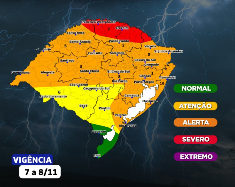 A Defesa Civil do Rio Grande do Sul emitiu alerta para a formação de um ciclone extratropical entre sexta-feira e domingo, com previsão de tempestades severas em diversas regiões do Estado. A partir desta sexta-feira, 7, o fenômeno deve provocar chuvas intensas, rajadas de vento superiores a 100 km/h e queda de granizo de grande porte, especialmente nas regiões Noroeste, Norte e Nordeste.