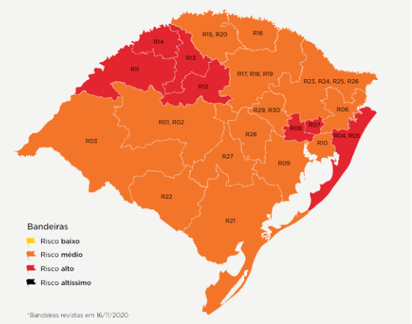 Das 21 regiões Covid, apenas Uruguaiana, Bagé e Guaíba não aderiram ao sistema compartilhado. As outras 18 já adotam protocolos alternativos às bandeiras definidas pelo governo – Cachoeira do Sul, Canoas, Capão da Canoa, Caxias do Sul, Cruz Alta, Erechim, Ijuí, Lajeado, Novo Hamburgo, Palmeira das Missões, Passo Fundo, Pelotas, Porto Alegre, Santa Cruz do Sul, Santa Maria, Santa Rosa, Santo Ângelo e Taquara.