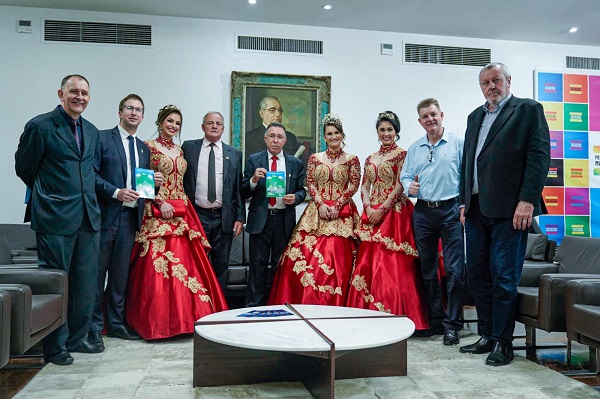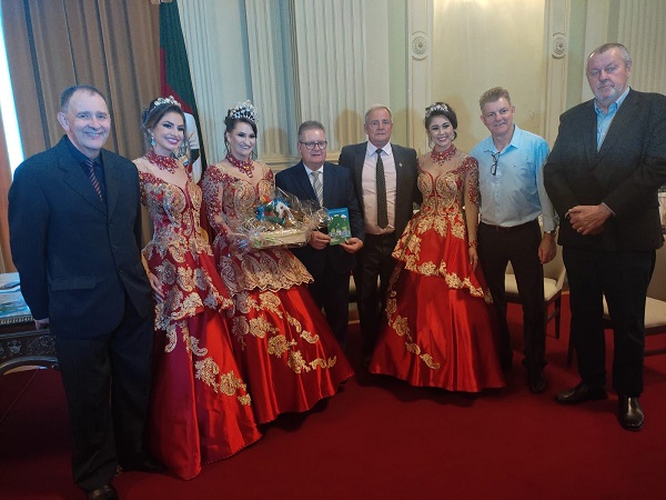 Uma comitiva da 10ª Exposição Industrial, Comercial, Serviços e Agronegócios de Candelária (Expocande) esteve visitando a capital do Estado nesta terça-feira, dia 19. Integrado pelo prefeito de Candelária, Nestor Ellwanger (Rim), pelo vice-prefeito, Cristiano Pinto Becker,  pelo presidente da 10ª Expocande, Jorge Luiz Mallmann, e pelas soberanas do município, rainha Marina Fernanda Aggens e suas princesas, Gabriele Renata Bredow e Priscila Ellwanger dos Santos Moraes, o grupo foi recebido pelo governador do Estado, Ranolfo Vieira Junior, no Palácio Piratini.