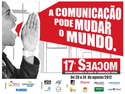 A comunicação pode mudar o mundo. Este é o tema da 17ª Semana Acadêmica do Curso de Comunicação Social (17ª Seacom) da Universidade de Santa Cruz do Sul (Unisc), que ocorrerá entre os dias 20 e 24 de agosto. O evento terá palestras, oficinas e Sessão da Tarde com exibição de vídeos produzidos pelos acadêmicos de Produção em Mídia Audiovisual em comemoração aos 10 anos da habilitação.