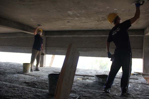 Com a concretagem das lajes e as instalações elétricas e hidrosanitarias concluídas, a fase atual é a finalização do reboco interno e externo.