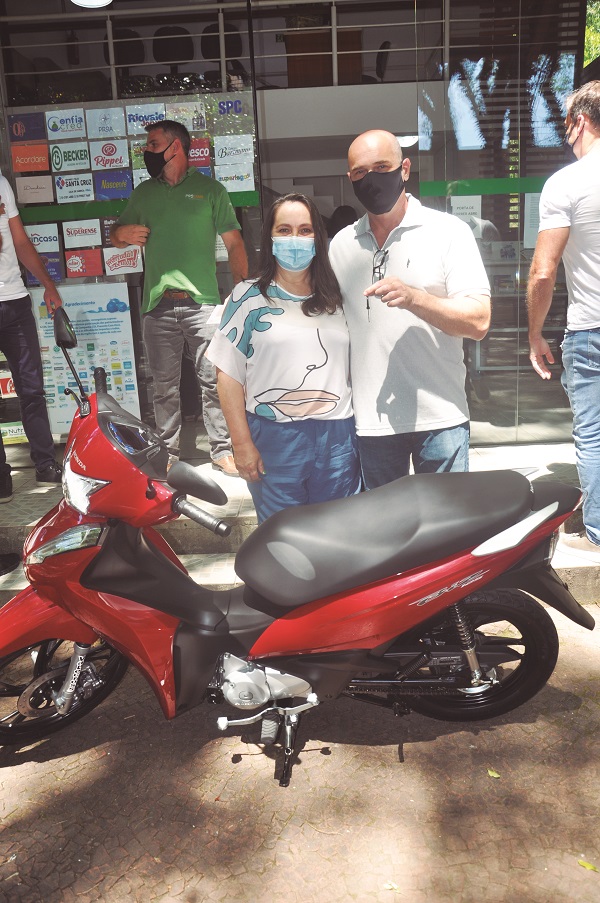 Marcos Gastão Meinhardt era só sorrisos com a moto Honda Biz 125, ano 2021/2021, no valor de R$ 10.590,00, conquistada no sorteio. Muita sorte mesmo, pois o torcedor do Internacional ganhou um veículo com a cor do seu time do coração. “Recebi a notícia quando minha esposa Claudia viu a publicação do resultado. Foi um grande presente de fim de ano. Sempre participei dos sorteios da CDL. É uma grande felicidade. Ficarei com a moto, pois é um sonho antigo. Queria, depois de me aposentar, comprar uma moto e agora realizei o que queria com a premiação recebida”, frisou o sortudo, que efetuou compras na Afubra.