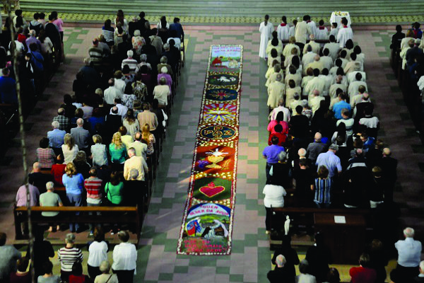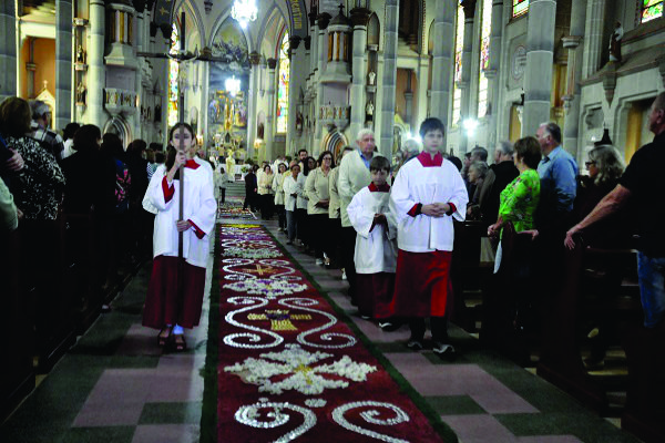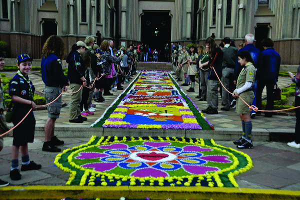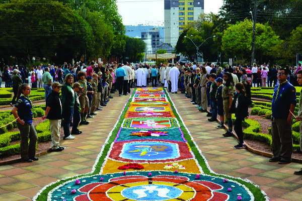 A procissão seguiu sobre os tapetes que foram decorados com os símbolos do batismo (desenhados com serragens coloridas, flores e tampinhas de garrafas). Este ano a Diocese trabalhou o tema com o início das pessoas na vida cristã e representou a religiosidade, a fé em Jesus Cristo e a comunhão de Deus, em suas obras estampadas em frente à Catedral.