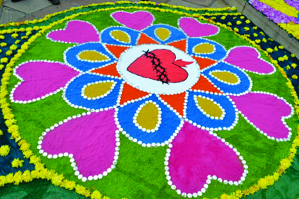 Com aproximadamente 80 metros de extensão, os tapetes foram desenhados pela coordenadora Lúcia Ertel, que há mais de 30 anos está envolvida com as celebrações, “é uma satisfação e uma alegria estar mais uma vez envolvida neste lindo trabalho. Agradeço a Deus que até hoje eu possa participar da elaboração e confecção dos tapetes com saúde”, completa. Os desenhos foram planejados já há alguns meses, e na manhã da última quarta-feira, 30, os tapetes começaram a ser confeccionados com o auxílio dos párocos Iris Thier, Sílvia Lersch e Roberto Cortês. Na quarta-feira à noite, crianças, jovens e adultos, juntamente do Grupo de Escoteiros, ajustaram alguns detalhes finais.