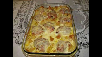 Tempere as coxas de frango com o alho, o sal, a pimenta-do-reino e a cebola picada. Deixe ficar no tempero por 2 horas. Descasque as batatas. Corte 1 batata em fatias finas, como se fosse fazer batata chips. Corte as outras 4 batatas em pedaços médios. Cada batata vai render 8 pedaços. Em um refratário, coloque um pouco de azeite no fundo. Faça uma “cama” para o frango com a batata cortada em fatias finas. Ou seja, você vai cobrir todo o fundo do refratário com essa batata fatiada. Depois disso acomode as coxas de frango sobre as fatias de batata. Pode colocar junto as cebolas que usou para temperar o frango. Ponha 2 fatias de bacon em cima de cada coxa. Coloque as batatas cortadas em pedaços entre as coxas de frango e ao redor delas. Leve para assar em fogo médio (200ºC), preaquecido, por 1 hora e 30 minutos. Quando estiver pronto, retire o refratário do forno e coloque o requeijão em cima das coxas de frango e das batatas. Polvilhe o queijo ralado. Retorne o refratário ao forno para gratinar por mais uns 10 minutos.