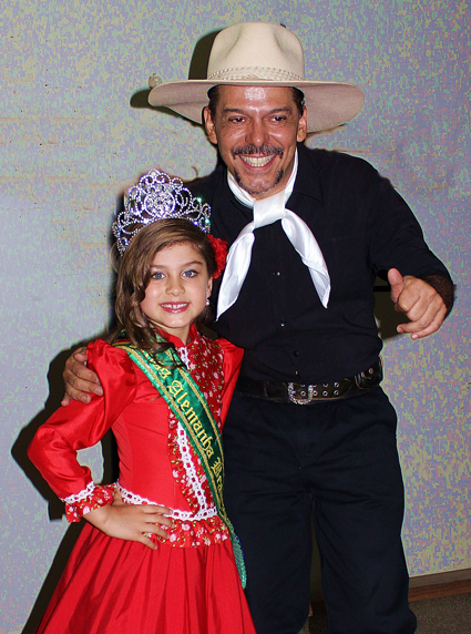 Milena Stepanienco Chagas com o apresentador do Galpão Crioulo, Neto Fagundes