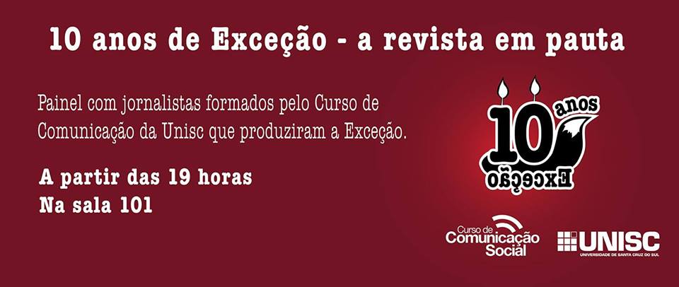 Às 19 horas desta quinta-feira, na sala 101 da Unisc, acontece o painel “10 anos de Exceção – A revista em pauta” que comemora os 10 anos da publicação laboratorial produzida por estudantes de jornalismo do Curso de Comunicação Social da universidade. O evento terá como convidados os jornalistas e ex-alunos do curso Francine Rabuske, Poliana Pasa, Letícia Mendes e Gelson Pereira.