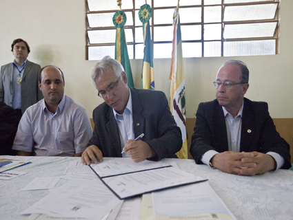 O Prefeito de Boa Vista das Missões Carlos Reginaldo Bueno, Beto Grill e o Presidente da Assembléia Legislativa Adão Villaverde assinam decreto de emergência que atende municípios atingidos pela estiagem no estado