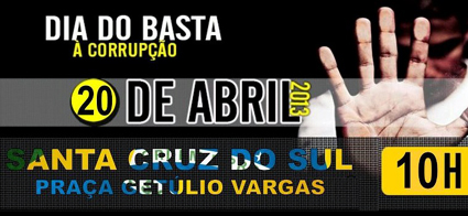 O fim de semana começa com protesto em Santa Cruz do Sul. Neste sábado, 20, a partir das 10h, a Praça Getúlio Vargas no centro da cidade, vai ser o palco do “Dia do Basta”, um movimento social pacífico sem fins lucrativos, que visa resgatar a ética e moralidade na política brasileira, combatendo a corrupção.