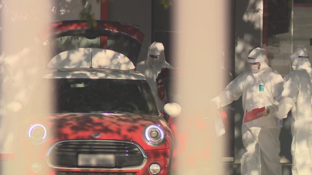 Jogadores do Inter receberam kits entregue por equipe usando trajes de proteção contra o coronavírus – Gabriel Bolfoni/RBS TV