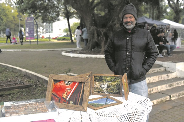 As molduras também são produzidas artesanalmente, na marcenaria da Ecovila Karaguatá, em Rio Pardinho, interior de Santa Cruz do Sul. Já as imagens são impressas por um estúdio localizado na Bahia, em papéis de alta durabilidade e diferentes texturas, conforme o sentimento que cada obra busca transmitir. Leo participa pela segunda vez de feiras – a primeira foi no mês passado, na Praça da Cultura, e tem criado cada vez mais apreço pela experiência.