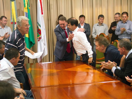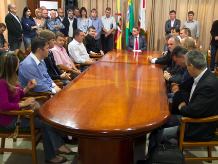 O anúncio da instalação de uma das mais importantes distribuidoras da região Sul do Brasil no ramo de medicamentos e produtos de higiene e beleza em Santa Cruz, foi aplaudido por lideranças do setor empresarial, vereadores, secretários municipais, vice-prefeita Helena Hermany e, sobretudo, pelo prefeito Telmo Kirst, na manhã da última terça-feira, 9, em cerimônia realizada no Palacinho da Praça da Bandeira.