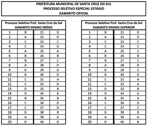 A Prefeitura de Santa Cruz do Sul realizou no último domingo, 30 de junho, na Faculdade Dom Alberto, o processo seletivo para preenchimento de 250 vagas de estágio em diversas áreas da administração. Ao todo cerca de 500 candidatos realizaram as provas, 167 vagas de nível superior e 83 de nível médio deverão ser preenchidas. O processo seletivo está a cargo do Centro de Integração Empresa-Escola (CIEE), responsável também pela elaboração das provas. Confira abaixo o gabarito oficial da prova que deverá contermplar 167 novos estagiários: