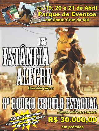 O tradicional rodeio do Centro de Tradições Gaúchas (CTG) Estância Alegre acontece desde ontem, 19 de abril e segue até amanhã, 21, no Parque de Eventos de Santa Cruz do Sul. Dentro das normas do Movimento Tradicionalista Gaúcho (MTG), vai distribuir R$ 30 mil em prêmios.