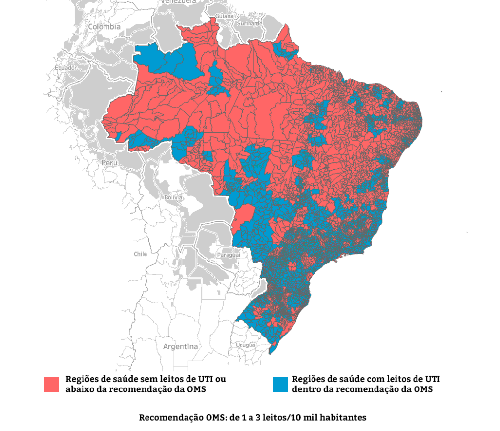De acordo com um levantamento feito pela agência de jornalismo “Pública”, cerca de 80% das regiões de saúde do país não possuem o número mínimo de UTI’s recomendado pela Organização Mundial da Saúde (OMS), uma a cada 10 mil habitantes. No norte e nordeste do país está a maioria das regiões que não atende o requisito, onde mais de 50% delas poderiam não conseguir lidar com a pandemia.