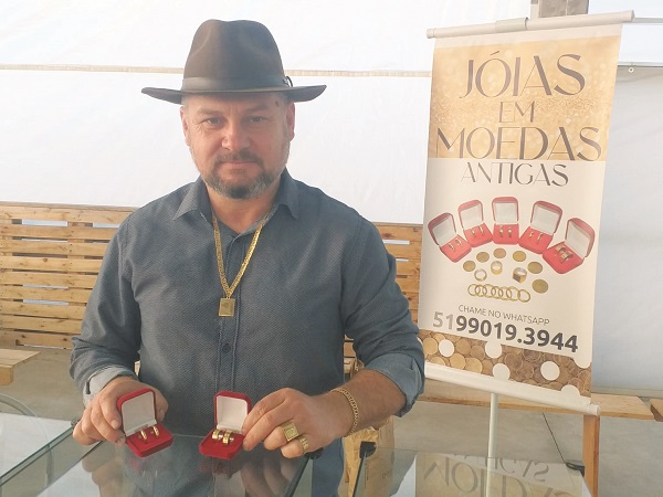 Apesar de estar no ramo da produção artesanal há dois anos, esta foi a primeira vez que Elton Fachini participou do Mercado das Pulgas. Ele confecciona, por encomenda, anéis masculinos e femininos, principalmente alianças de casamento, utilizando como matéria-prima moedas antigas – algumas até centenárias. Apesar de trabalhar na construção civil, a arte em moedas é uma atividade que deixa Elton feliz e realizado.