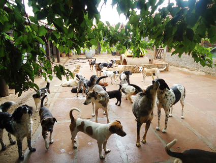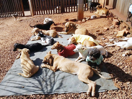 Animais tomam sol no pátio do Abrigo São Francisco. Atualmente 210 aguardam por um lar