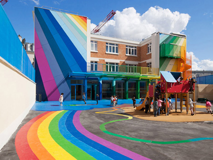 Uma tradicional escola em Paris, capital francesa, foi totalmente reformada. O grande e arejado edifício de 1940 ganhou novas janelas, teve a fachada refeita e repintada. Até aí, nada demais. Mas o escritório de arquitetura Palatre & Leclère foi um pouco além do que simplesmente reformar o jardim de infância. Os arquitetos reimaginaram o prédio, com uma explosão de cor e criatividade.