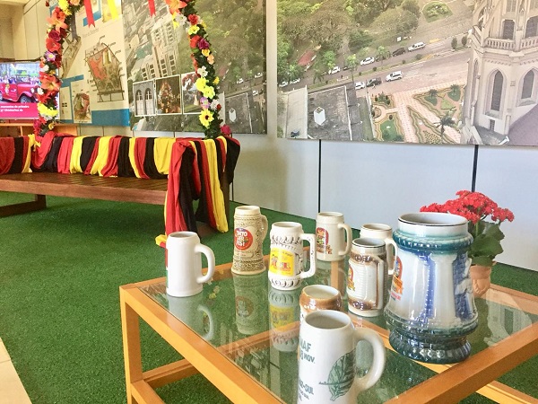 O espaço Memórias da Oktoberfest está decorado nas cores da bandeira da Alemanha – vermelho, amarelo e preto – com muitas flores, guirlandas e adereços, além de música ambiente com as tradicionais bandinhas.