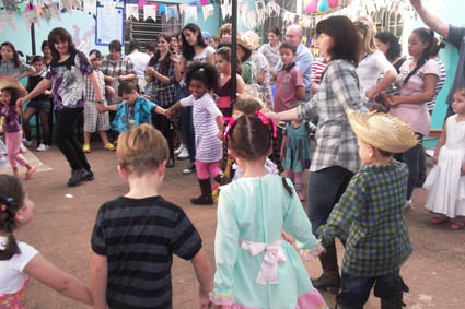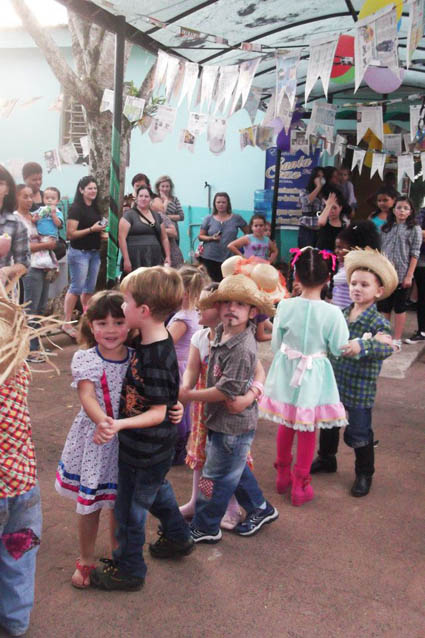As crianças apresentaram danças juninas como a quadrilha e o forró e se divertiram com as brincadeiras juninas.