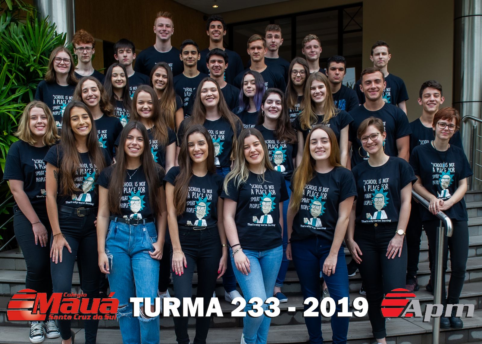 Turma 233: Alice Elvira Teixeira Dos Santos, Amanda Larissa dos Santos, Ana Carolina Teixeira Lau, Anabel Richter Santolin, Arthur Rodrigues Werlang, Bernardo Zambrano Bolzan, Bruna Rodrigues Matte, Catharina Hermes Frantz, Eduarda Lima Brum Magalhaes, Fernanda Carolina Zillmer, Fernanda Luiza Back , Gabriel da Silva Santos, Guilherme Ebert, Henrique Tadano Martins, Isabella Schweitzer Hiller, Jullia Flores Pritsch, Leonardo Paul, Lucas Armando Jahn da Silva, Lucas Fischer Azevedo, Lucas Rambo Knapp, Luiza Neumann Bay, Maite Andraschko Cano, Mariana Teixeira Pereira, Marilia Helena Neis, Martina Keller Eidt, Matheus Henrique Griebel, Matheus Reusch, Pedro Montagner Conceição Lacroix, Pedro Tassinari Bandinelli, Sofia Willrich Bueno e Vitoria Eduarda Andraschko Simon.