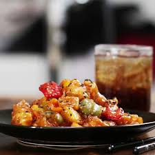 Em uma frigideira, em fogo médio, coloque a água, o molho shoyu, o vinagre de arroz, o mel, o açúcar mascavo e o molho de tomate. Misture bem e cozinhe por 5 minutos, ou até o molho engrossar. Reserve. Em uma tigela grande, coloque o frango, o sal, o molho shoyu e os ovos. Mexa até que o frango esteja completamente coberto pela mistura. Adicione o amido de milho (100 g) e misture bem. Em uma panela grande, em fogo alto, frite os pedaços de frango até ficarem com todos os lados bem dourados. Deixe-os escorrer em um prato forrado com papel-toalha. Em uma frigideira grande, em fogo médio, aqueça o azeite e cozinhe o alho e o gengibre por 30 segundos ou até o alho ficar ligeiramente dourado. Acrescente o pimentão e a cebola. Cozinhe por 2-3 minutos ou até a cebola ficar translúcida. Adicione o abacaxi e cozinhe por 1 minuto ou até o abacaxi ficar ligeiramente dourado. Coloque o frango frito. Misture a água e o amido de milho (50 g) e acrescente-os ao frango. Misture bem e cozinhe por 3-4 minutos ou até que o molho fique grosso como mel. Polvilhe com o gergelim e sirva quente.