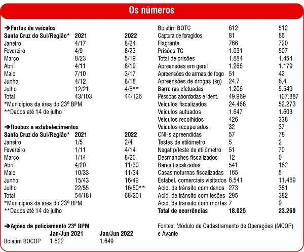 Com seu efetivo, o 23º Batalhão de Polícia Militar (BPM), em Santa Cruz do Sul, atua para coibir a criminalidade e garantir a segurança e a tranquilidade da população. Nesse contexto, de janeiro a junho deste ano foram efetuadas 5.549 barreiras policiais, contra 1.206 no mesmo período do ano passado. A retração de 2021 se deu em virtude da pandemia de covid-19, onde a comunidade saiu menos, assim como diminuiu a ocorrência de delitos. Isso não significou que o trabalho realizado pela BM tenha reduzido. Pelo contrário, apenas mudou de foco, quando prestou apoio ao Poder Público nas intervenções em festas clandestinas, aglomerações e cobrança do uso da máscara.