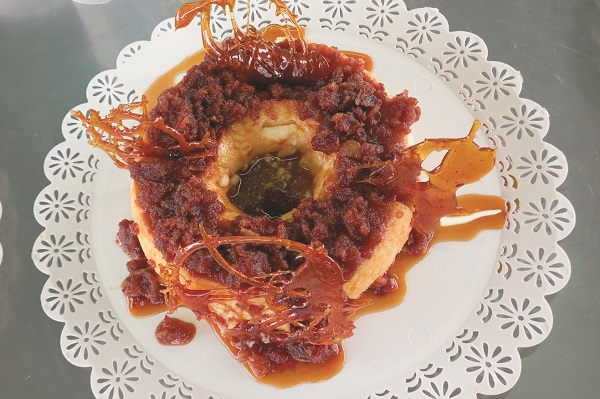 7º– Desenforme o pudim e espalhe por cima a cobertura.