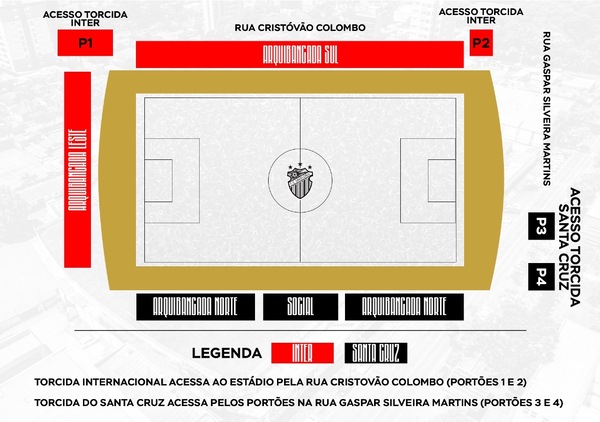 Os torcedores alvinegros ingressarão pelos portões 3 e 4, na Rua Gaspar Silveira Martins, e ocuparão as arquibancadas ao lado do Tênis Clube Santa Cruz. Os colorados vão acessar as entradas 1 e 2, na Rua Cristóvão Colombo, para se instalarem nos outros dois setores.