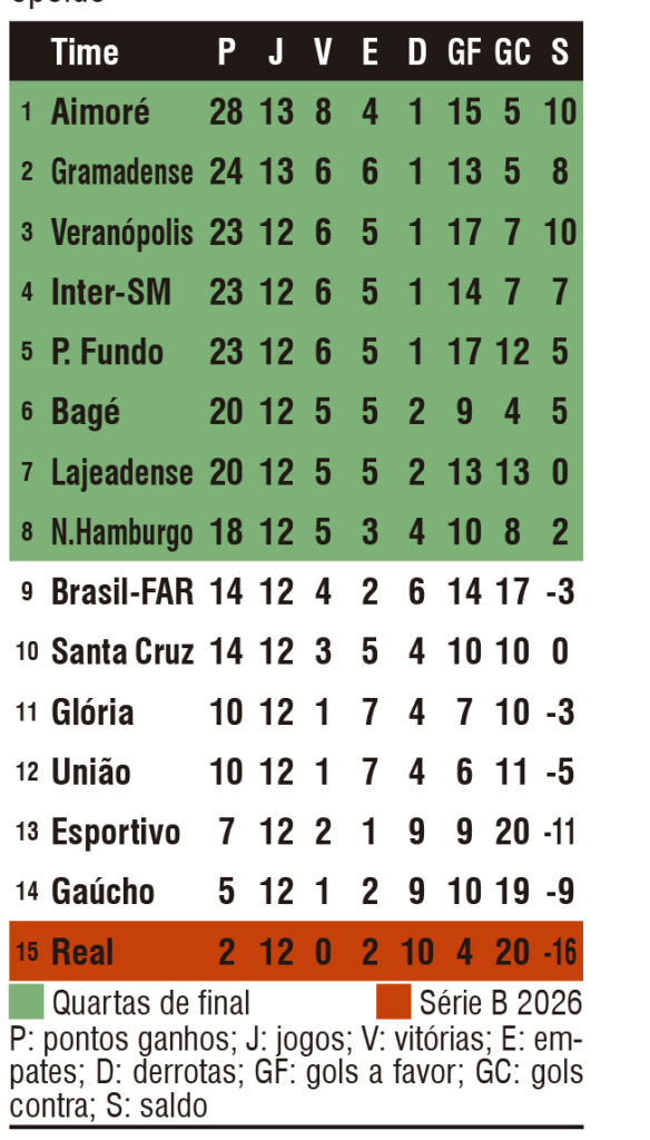 Confira a tabela de classificação da Série A2: