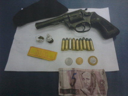 Com o indivíduo foram localizados um revólver calibre 38, munição e duas pequenas porções de maconha, além de papel de seda para embrulhar entorpecentes e uma pequena quantia em dinheiro.