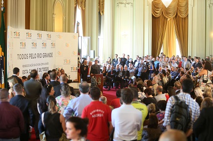 O governador José Ivo Sartori convocou representantes dos poderes institucionais, sindicatos e segmentos sociais a “criar um ambiente de unidade de mobilização” em torno da dívida do Estado com a União, durante ato na manhã desta sexta-feira (26) no Palácio Piratini. Sartori sugeriu a formação de uma comitiva representativa de todos os segmentos sociais para ir a Brasília lutar pelo direito do Rio Grande do Sul. “Nós cumprimos aqui, hoje, um papel que não é de governo, mas de Estado”, afirmou Sartori.
