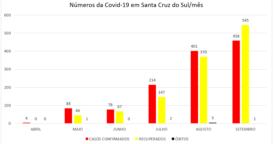 No mês de setembro, por exemplo, foram confirmados 57 casos a mais que o mês anterior – agosto – e um óbito. Já no mês de agosto foram 187 pessoas a mais que julho que testaram positivo para a doença e cinco pessoas vieram a óbito. Em setembro, o número que mais registrou aumento foi o de recuperados (545), enquanto que o de casos confirmados foi de 458. Em agosto, os casos confirmados ainda eram superiores (401) aos recuperados (370). Já o total de confirmações da doença desde o primeiro caso é de 1.250, sendo que 1.179 pessoas estão recuperadas e nove pessoas vieram a óbito.