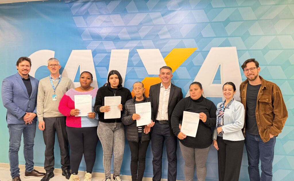 Na manhã desta sexta-feira (12), o secretário para a Reconstrução do Rio Grande do Sul pelo Governo Federal, Maneco Hassen, participou de mais um evento de entrega de moradias na sede da Caixa Econômica Federal de Santa Cruz do Sul, para famílias deste município e de Sinimbu, ambas do Vale do Rio Pardo, que sofreu com as enchentes de maio de 2024.