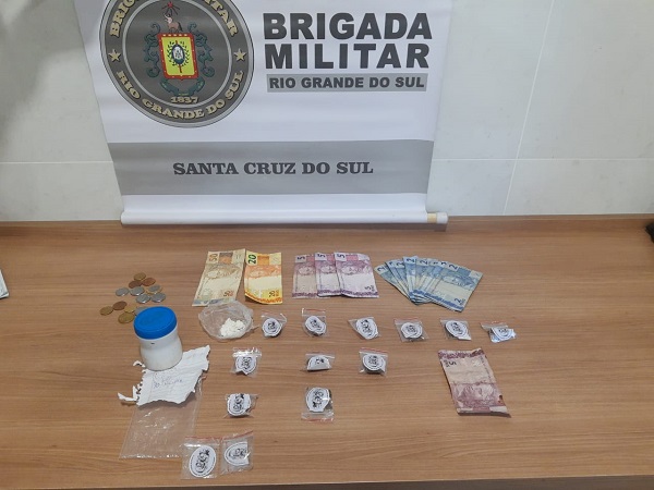 Ao realizar a abordagem do homem, com o qual foi encontrado um frasco de plástico com oito porções de maconha, uma porção de cocaína, um papel com anotações e R$ 104,80. Com o usuário também foram encontrados três porções de maconha e R$ 5.