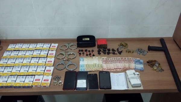 No local foi flagrado dois homens comercializando drogas a um condutor de um automóvel. Após diligências realizadas pelos policiais no local, foram apreendidos os seguintes materiais: 20 buchas de maconha, um tijolo de maconha (252 gramas), quatro algemas, uma bastão, quatro aparelhos celulares, um caderno de anotações, R$ 702 em espécie e 35 carteiras de cigarro.