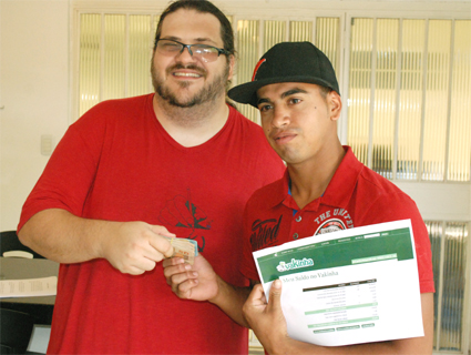 Jonatam (D) recebendo do publicitário Jojow o valor doado pelos 140 voluntários