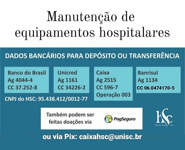 Mais informações podem ser obtidas pelo e-mail: [email protected] . Interessados em colaborar com a campanha para manutenção de equipamentos hospitalares do HSC podem fazer a doação para as contas a seguir: