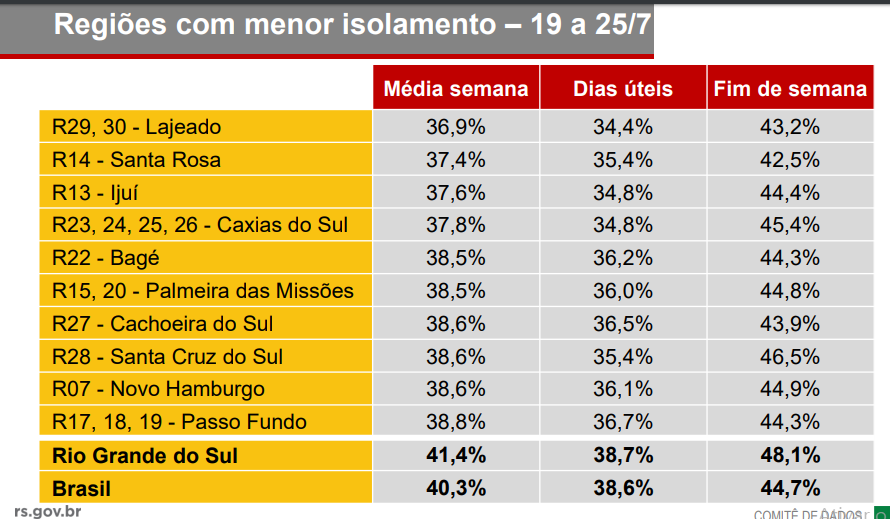 As demais áreas com melhor desempenho estão em municípios que estão sob bandeira vermelha (risco alto) pelo modelo de Distanciamento Controlado. É o caso de Porto Alegre (42,8%) e Capão da Canoa (41,8%). Na média da semana, as principais regiões com baixo nível de isolamento são  Lajeado (36,9%), Santa Rosa (37,4%), Ijuí (37,6%) e Caxias do Sul (37,8%).