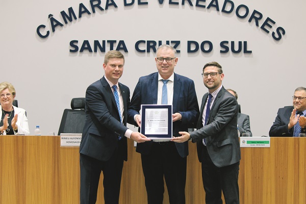 A Câmara de Vereadores de Santa Cruz do Sul concedeu o título de Cidadão Santa-Cruzense a Irineu Alfonso Henn na noite da última segunda-feira, 9. Ele é vice-presidente operacional da CTA, de Venâncio Aires, sua terra natal, mas mora em Santa Cruz do Sul, onde possui grandes laços de profissão e de amizade. A proposição foi do vereador e líder de governo, Henrique Hermany (Progressistas).