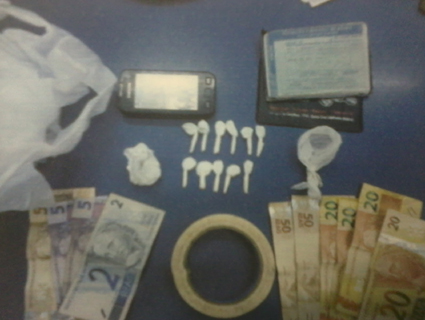 Nesse momento os policiais iniciaram a abordagem aos dois indivíduos. Ao tentar pular a janela para dentro do bar novamente, o morador da casa e dono do estabelecimento, identificado como Junior Rafael Pinto Ribeiro, de 22 anos, acabou deixando cair cinco buchas de cocaína no chão. No bolso da bermuda que ele utilizava no momento da abordagem também foram localizados R$62,00.