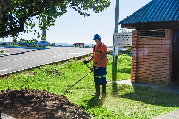 A Secretaria de Desenvolvimento Econômico e Turismo iniciou os serviços de limpeza e roçada no Complexo Lago Prefeito Telmo Kirst na manhã desta segunda-feira, 15.