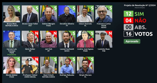 A primeira pauta colocada em votação foi a do projeto de resolução 2/2024, que trata sobre o julgamento de representação contra o vereador Henrique Hermany. O relatório foi aprovado com 12 votos favoráveis – houve quatro contrários. Nicole e Leonel em conjunto e Edson Azeredo (PL) anunciaram que pedirão a abertura de processo de cassação de Hermany.
