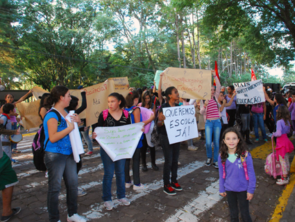 Com cartazes e roupas pretas, os alunos, pais, professores e comunidade da Escola José Mânica realizaram uma manifestação no fim da tarde de terça-feira, 2 de abril. A reivindicação foi pela construção de um novo prédio, permitindo que os cerca de 240 alunos voltem a estudar na área da escola.