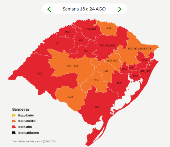 A 15ª rodada do Distanciamento Controlado traz 14 regiões com alto risco epidemiológico alto – configurando o mapa definitivo mais vermelho desde que o modelo foi implementado, em maio. A divulgação foi feita nesta segunda-feira, 17, pelo governador Eduardo Leite em transmissão pelas redes sociais. As bandeiras ficam vigentes a partir da desta terça, 18, até as a próxima segunda-feira, 24.