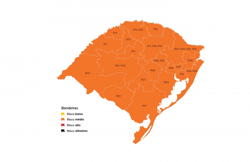 O Gabinete de Crise deferiu, nessa segunda-feira, 2, o pedido de reconsideração enviado pela região de Santa Rosa, única região preliminarmente classificada em bandeira vermelha (risco epidemiológico alto) no mapa divulgado na sexta-feira, 30. Sendo assim, as 21 regiões estão em bandeira laranja (risco médio) na 26ª rodada do modelo de Distanciamento Controlado. A última vez que o mapa ficou completamente laranja foi na vigência da 21ª rodada, entre os dias 29 de setembro e 5 de outubro.