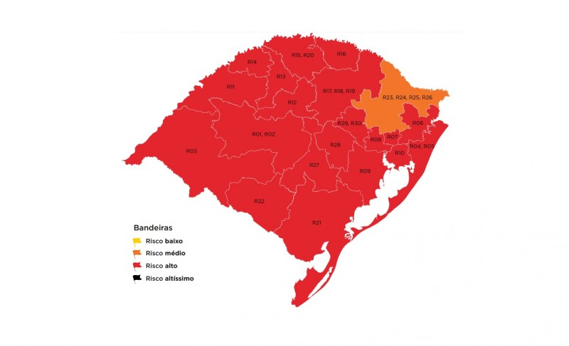 Das 21 regiões Covid, apenas uma, Caxias do Sul recebeu bandeira laranja. As demais receberam bandeira vermelha, com alto risco epidemiológico.